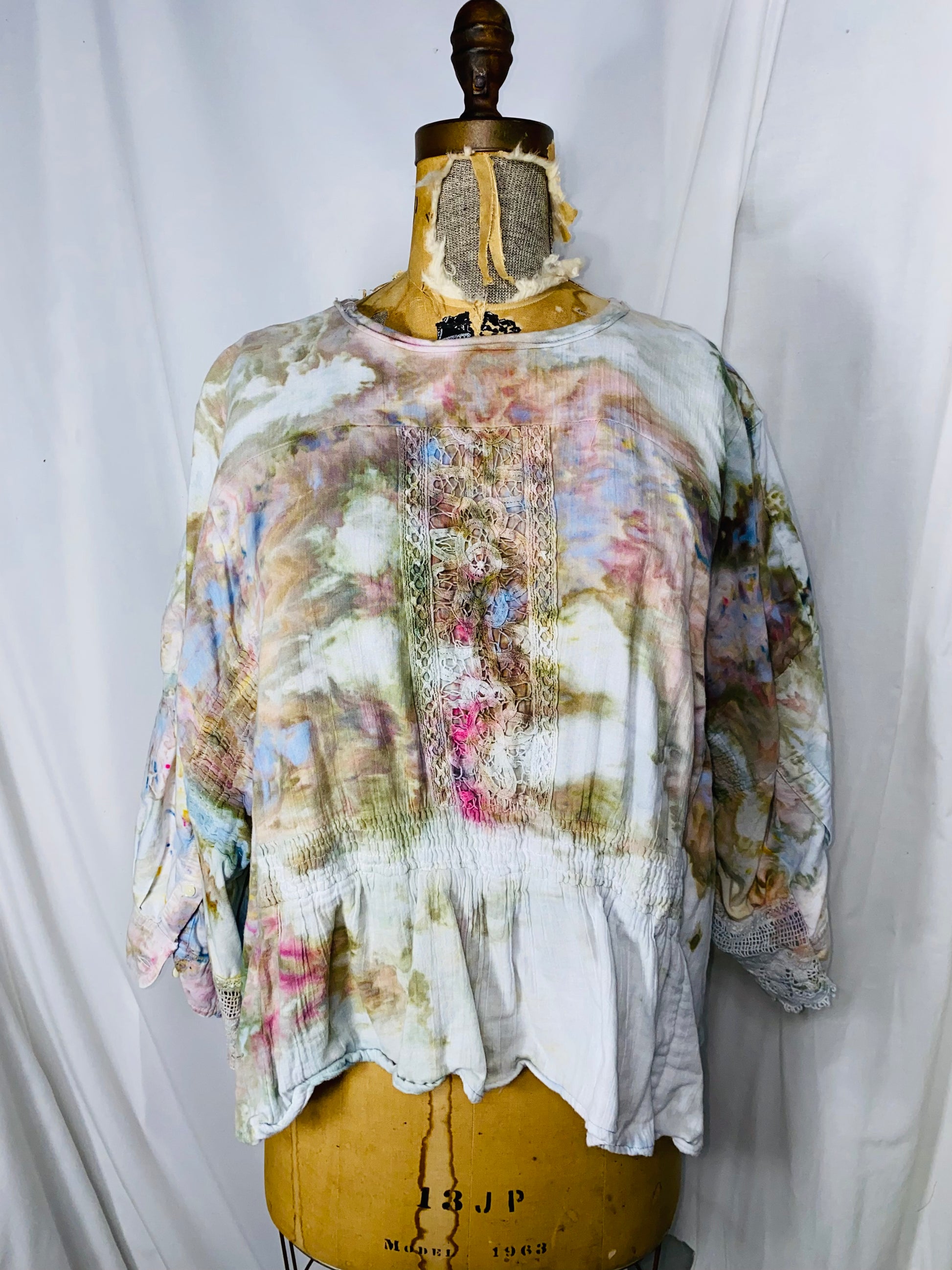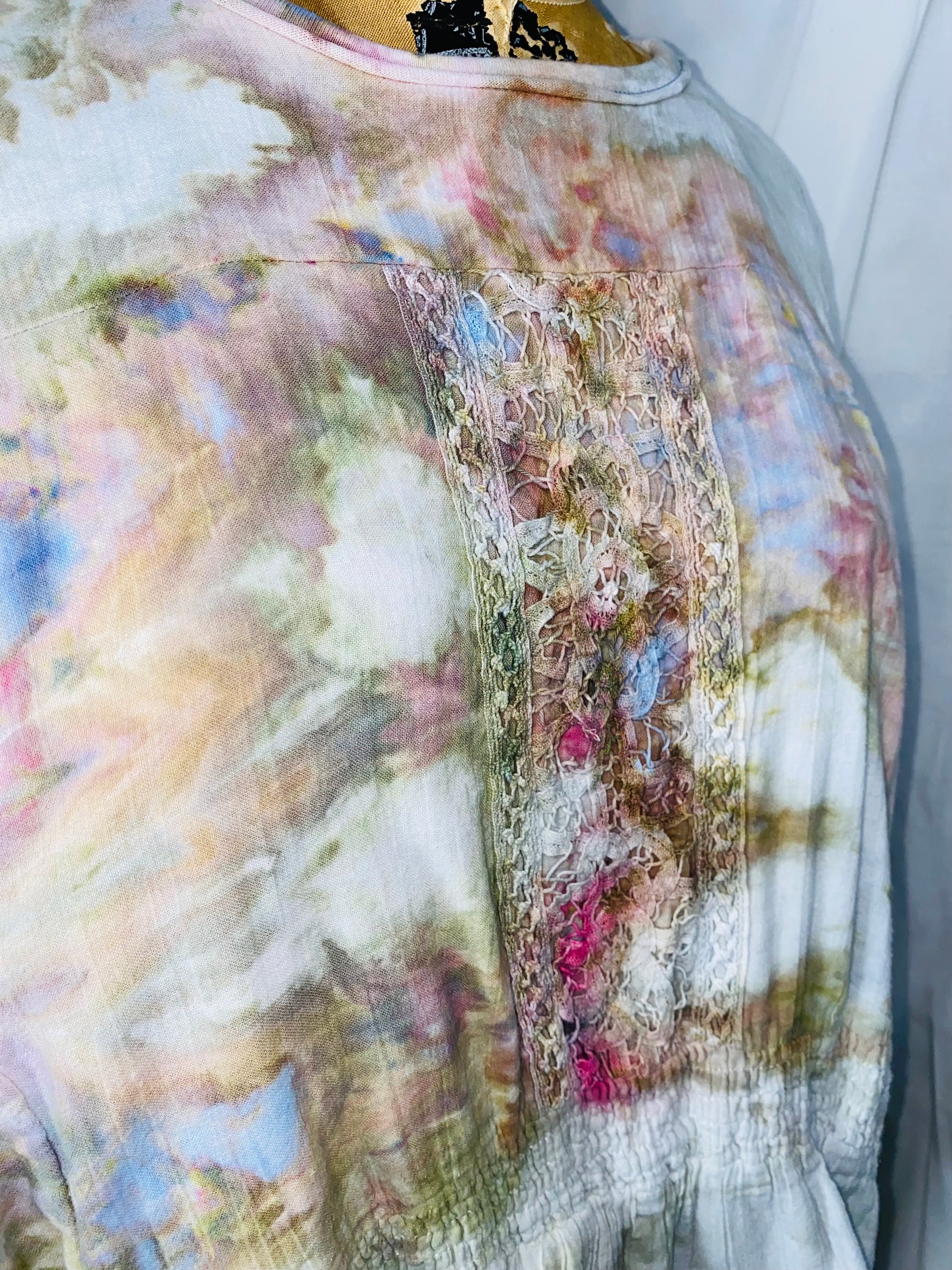 Cotton gauze and Battenburg lace with elasticated smocking, lace sleeves