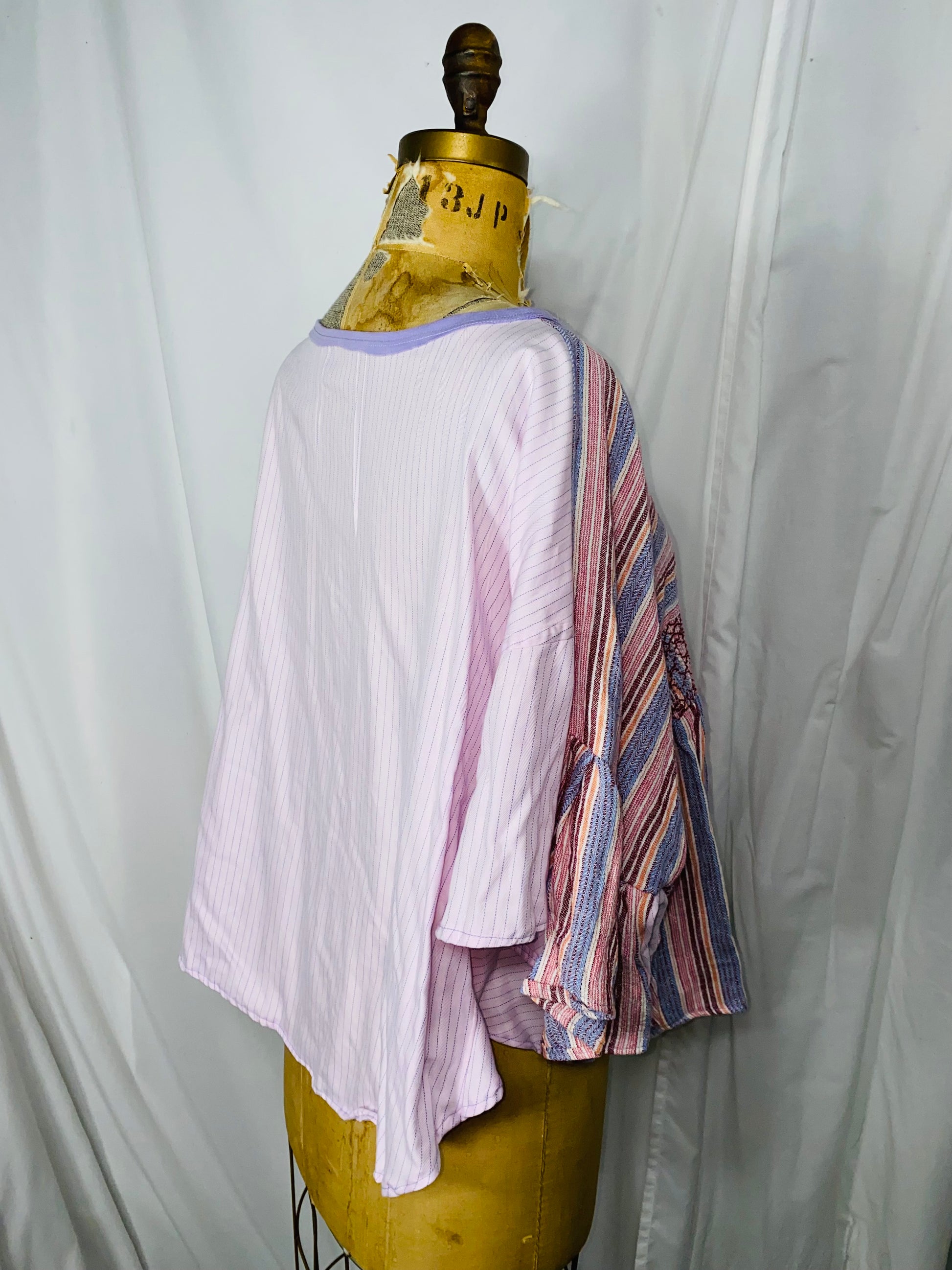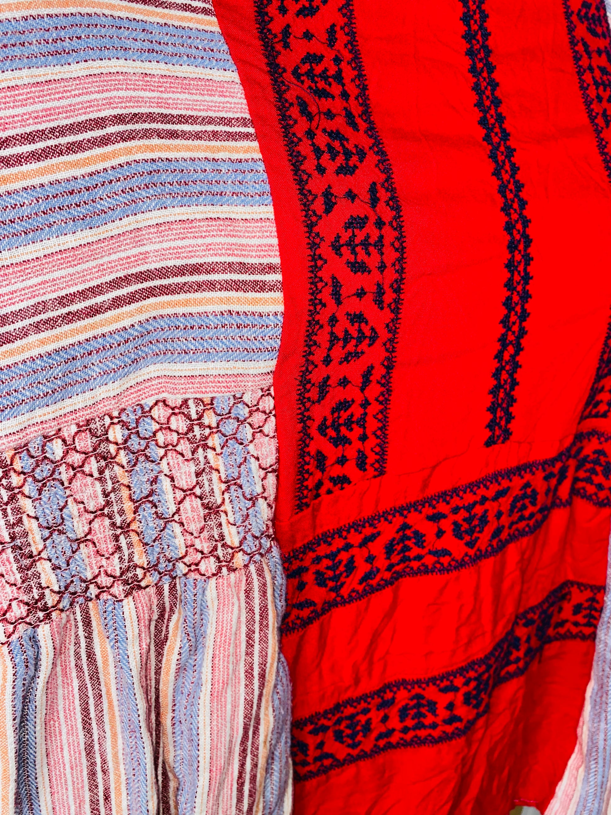 Machine embroidered panels with textured woven cotton, elasticated smocking, cotton broadcloth back