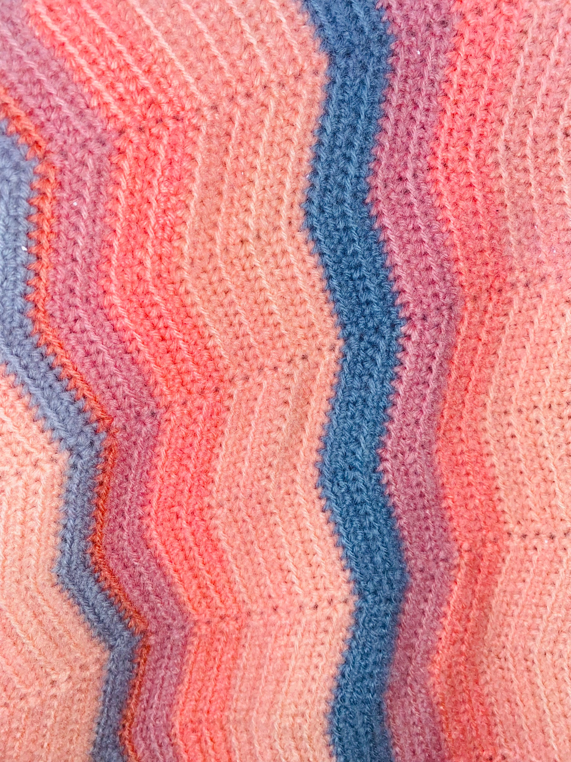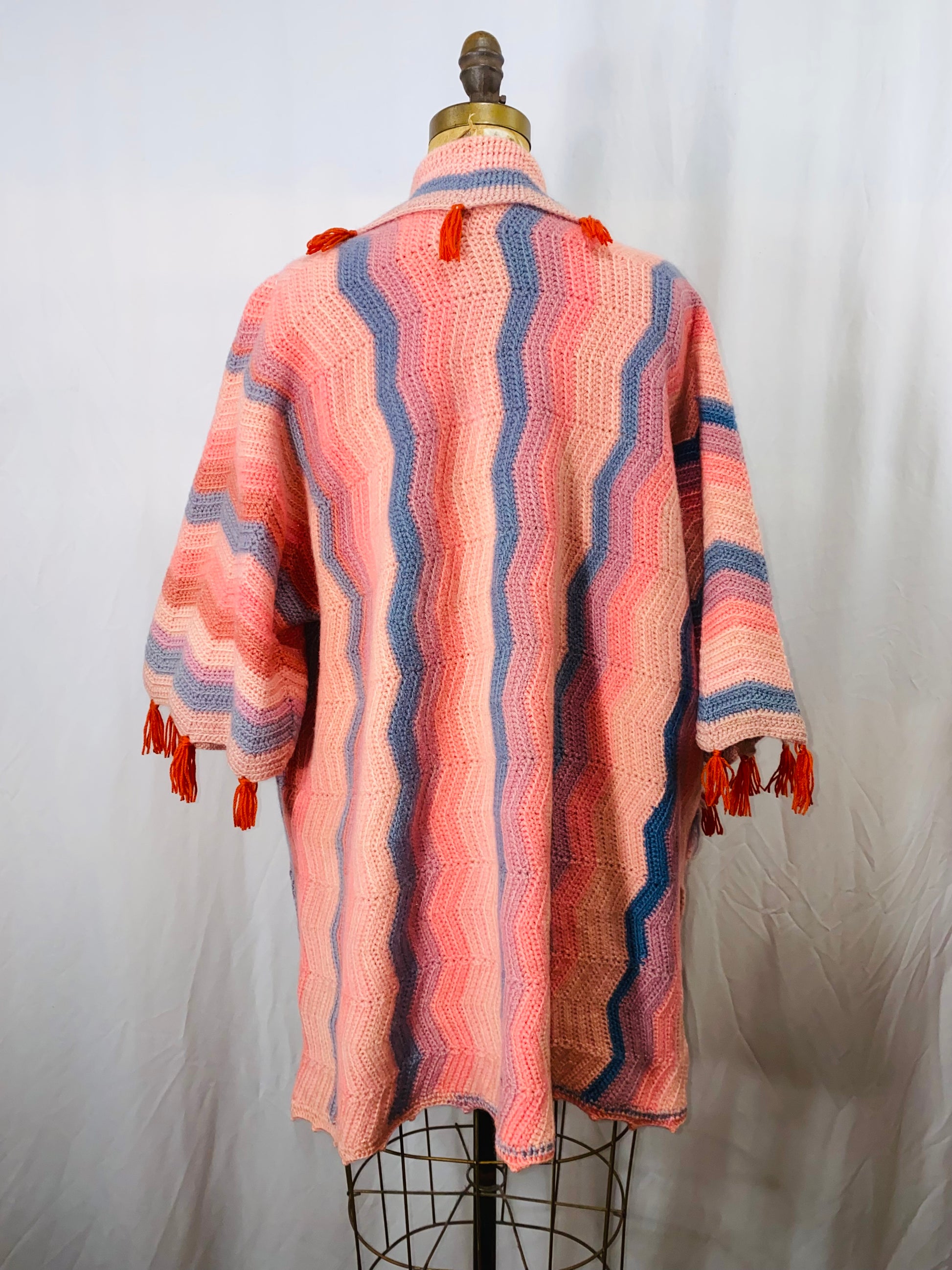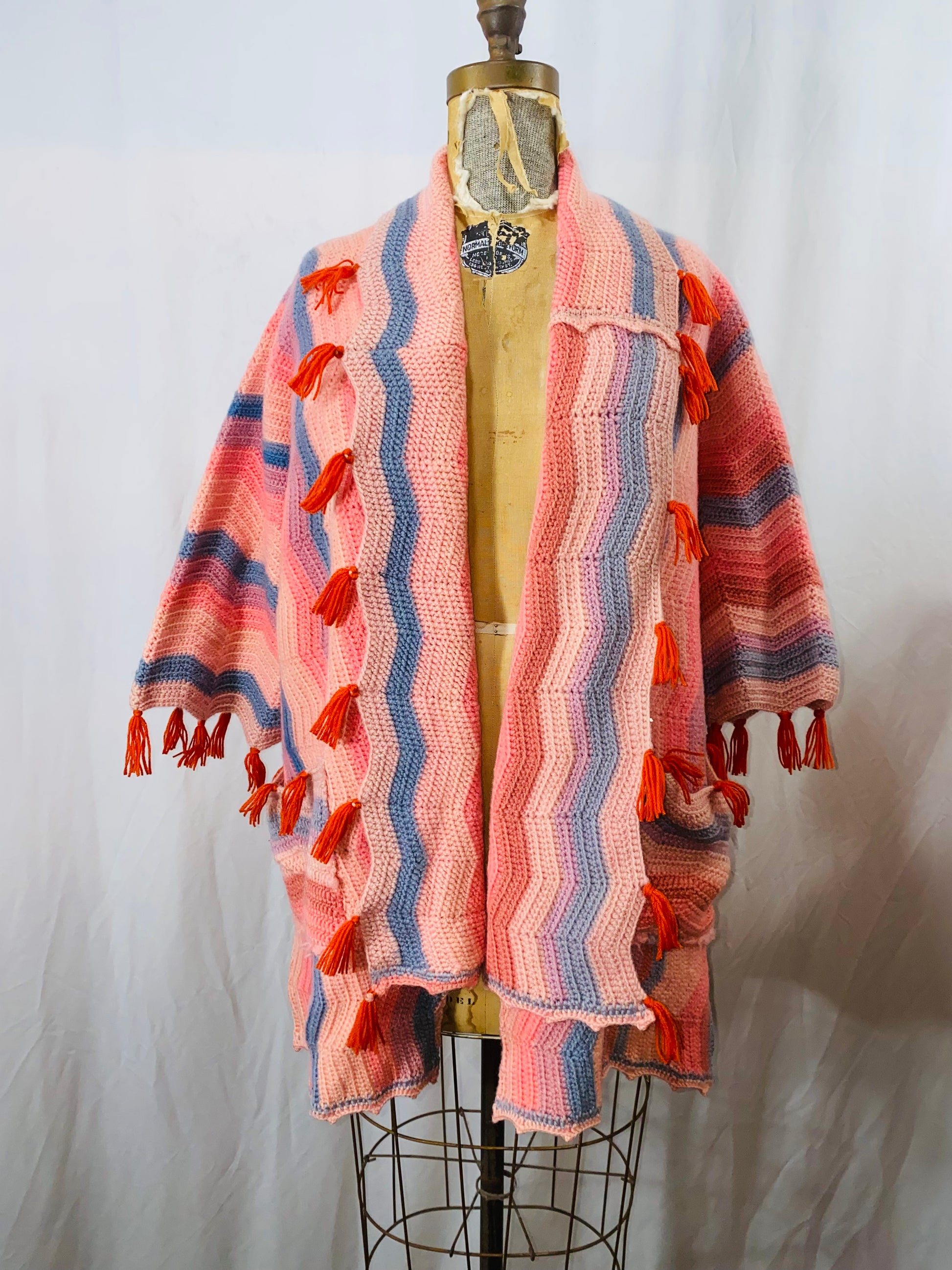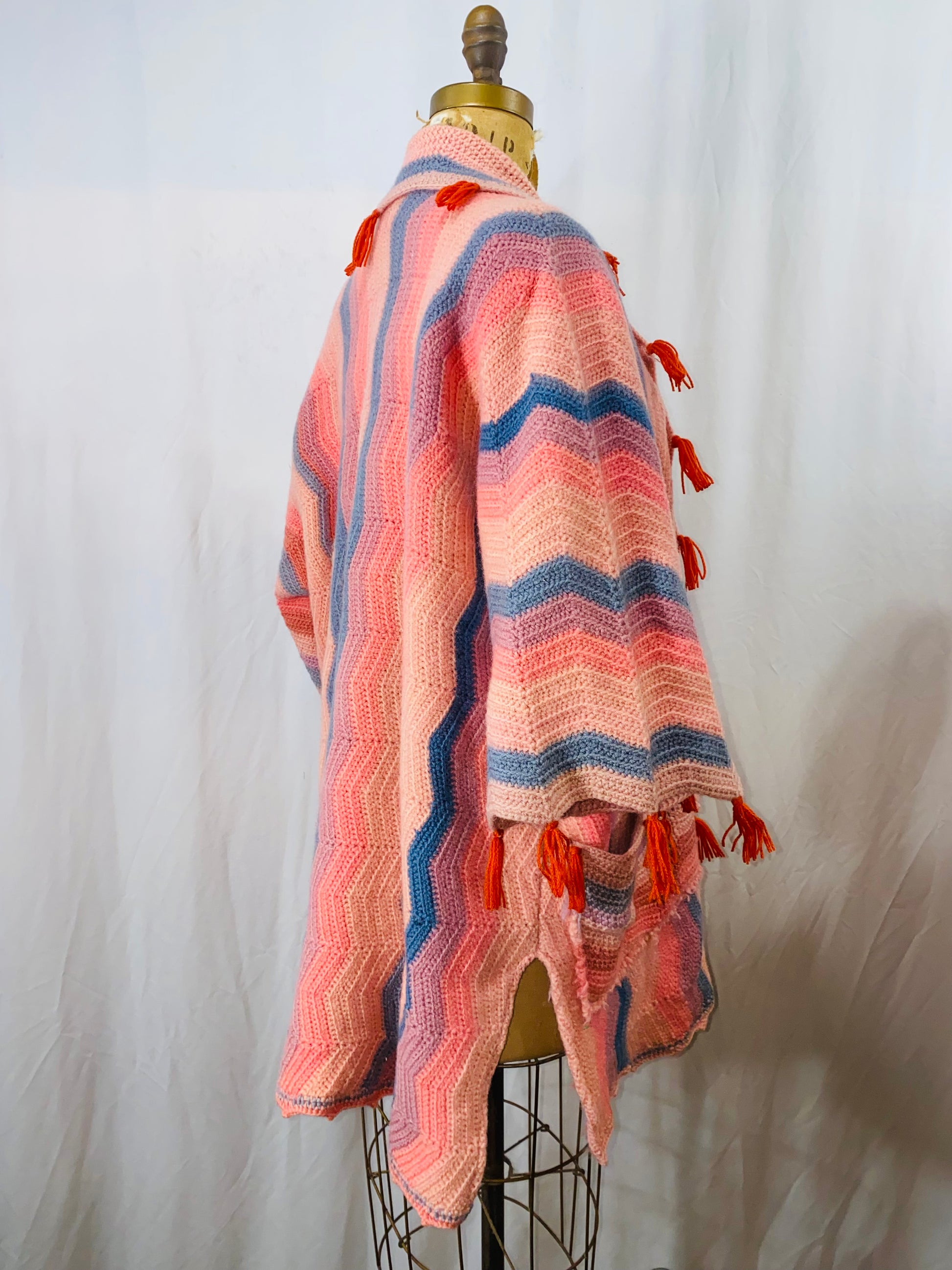 All wool, medium weight, front pockets, very nice wool used on this one, love the tassels and the colorway of this flame stitch, this one is incredible! The pearl-scalloped bottom lets you know that the original blanket was made by an expert.