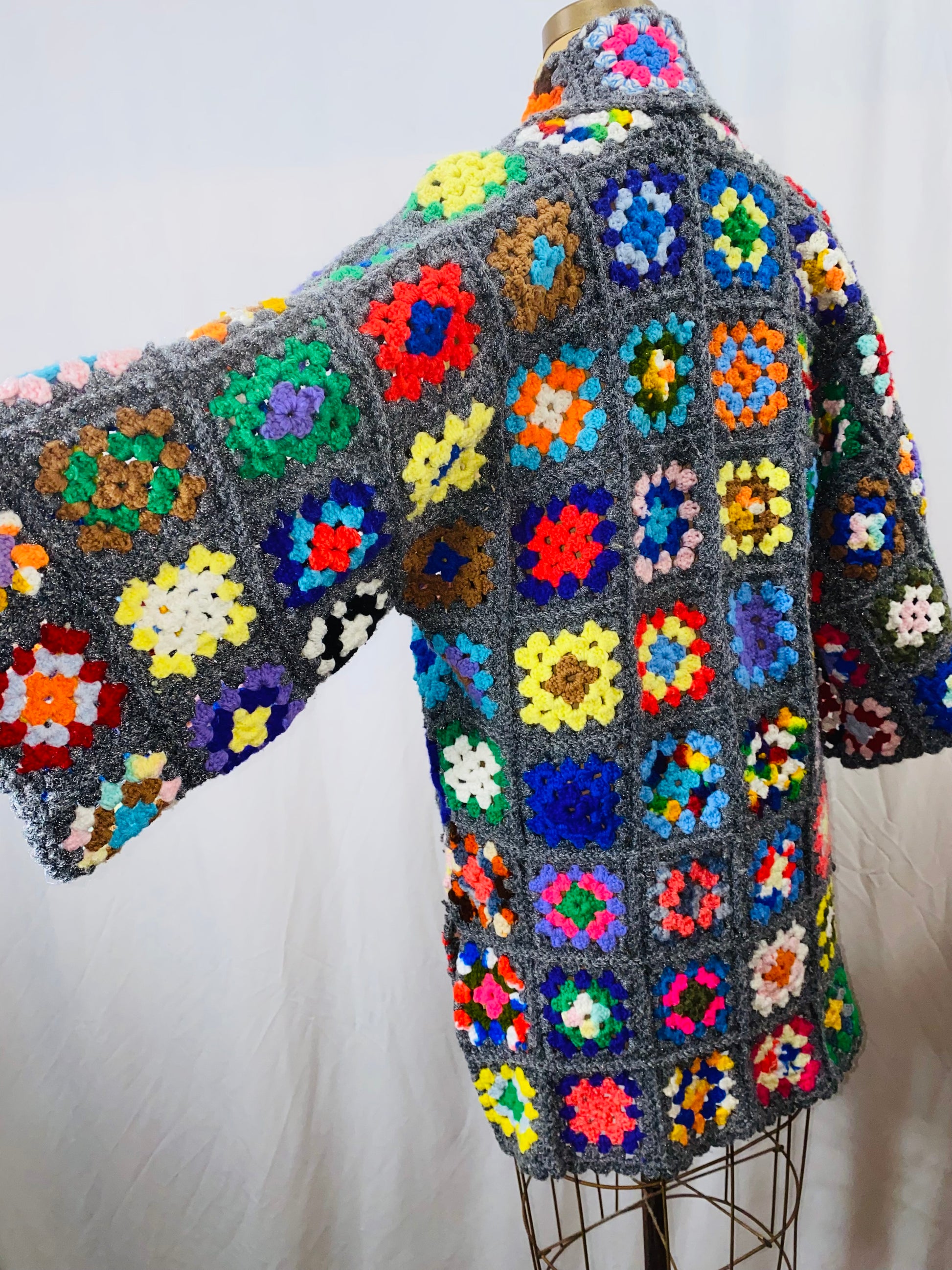 Cotton/acrylic blend vintage crochet, love this metallic grey with vibrant colors, front pockets